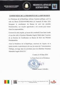« La Présidence de la République informe l’opinion publique qu’à la suite du décret D/2026/059/PRG/SGG du vendredi 20 mars 2026, limogeant le coordinateur du Bureau de suivi des priorités présidentielles, une enquête approfondie a été ouverte pour mieux situer les responsabilités », précise le communiqué.