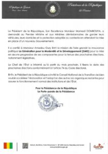 Sur le plan politique, le Chef de l’État a confié une mission d’envergure à Monsieur Amadou Oury Bah. Ce dernier est chargé de dynamiser et de faire croître la mouvance politique « la Génération pour la Modernité et le Développement (GMD).