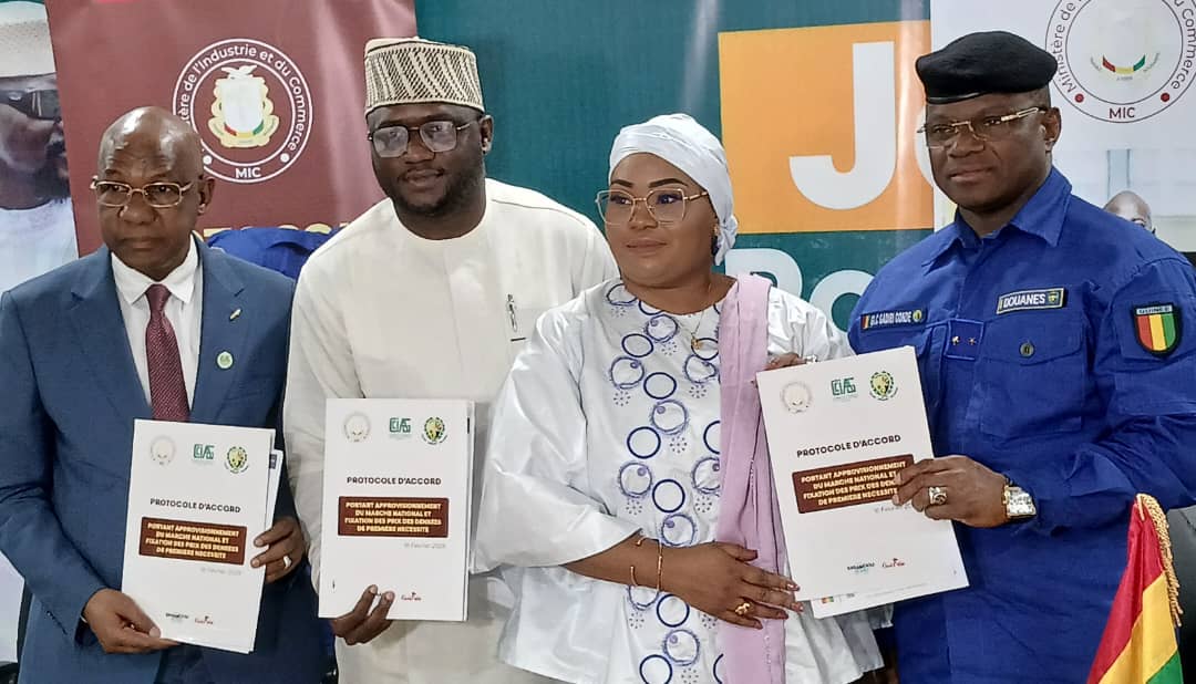 Sous la présidence de la Ministre du Commerce, de l’Industrie et des PME, Mme Fatima Camara, un protocole d’accord majeur a été signé afin de garantir l’approvisionnement régulier du marché et d’encadrer les prix des denrées de première nécessité.