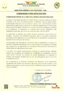 À moins de deux mois des élections législatives et communales prévues pour le 24 mai 2026, la tension monte d’un cran dans les instances de régulation. Par voie de communiqué officiel (N°0005/MATD/DGE/2026), la Direction Générale des Élections (DGE) a fermement réagi ce mardi à la circulation de fausses informations concernant les critères d’éligibilité des candidats.