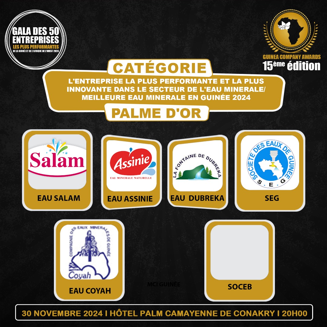 💧 Ne manquez pas cette occasion de célébrer l’innovation et la qualité dans le secteur de l’eau minérale en Guinée. Qui sera couronné ? Soyez présents pour le découvrir !