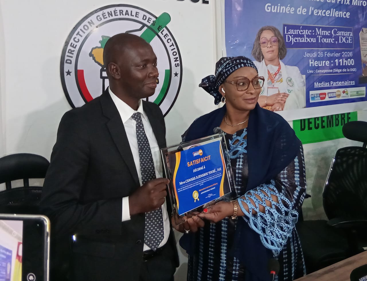 Les Prix Miroir Guinée de l’Excellence, Africain Almamy Samory Touré de la Bravoure Féminine 2025, ainsi que celui de Tamara Magazine ont été remis, ce jeudi 26 février 2026, à Mme Camara Djenabou Touré, directrice générale des élections (DGE). La cérémonie de remise s’est déroulée au siège de l’institution, à Camayenne, en présence de plusieurs acteurs politiques.