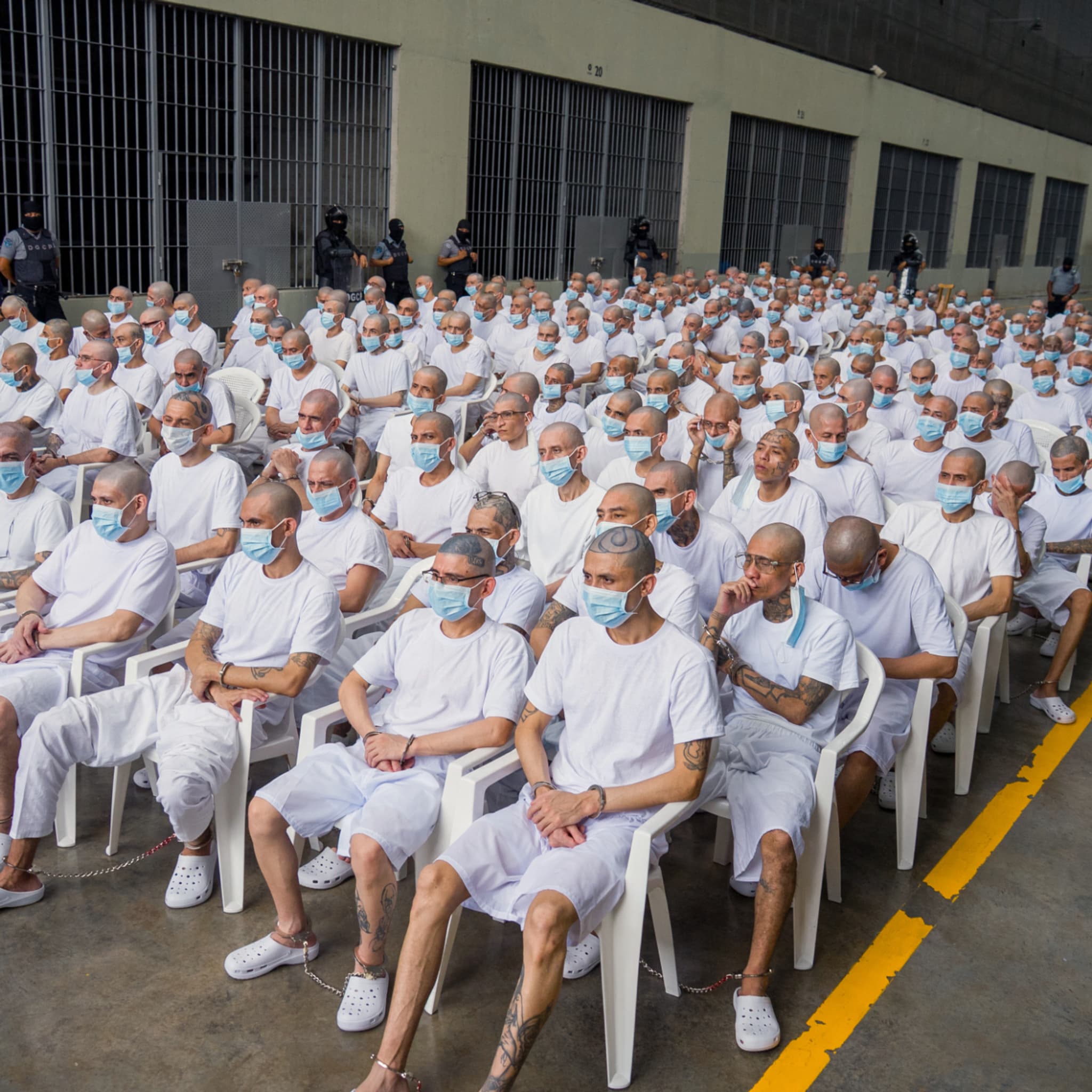 Des centaines de silhouettes au crâne rasé, vêtues de blanc, enchaînées aux mains et aux pieds. L’image, diffusée par les autorités salvadoriennes, est devenue l’un des symboles les plus marquants de la politique sécuritaire du président Nayib Bukele. Elle a été captée lors de l’ouverture, le 20 avril, d’un procès hors norme visant 486 hommes suspectés d’être membres de la Mara Salvatrucha, plus connue sous le nom de MS-13, et accusés de dizaines de milliers de crimes.