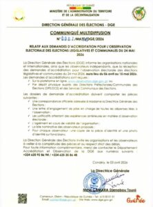 Accueil A LA UNE Scrutin du 24 mai : La DGE lance le processus d’accréditation pour... A LA UNEPOLITIQUE Scrutin du 24 mai : La DGE lance le processus d’accréditation pour les observateurs électoraux Par DIRECTEUR DE PUBLICATION - 6 avril 2026 112 Facebook Twitter Pinterest WhatsApp ARTICLES CONNEXESPLUS DE L'AUTEUR Figure montante du secteur Bancaire : Mme Oularé Nancy Miriam Camara Conakry : L’excellence scolaire à l’honneur lors de la 17ème édition de Miss & Masters Bôrô Guinée : Hommage à Aboubacar Demba Camara, le géant qui ne meurt jamais