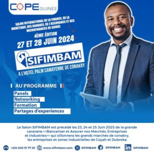 –Ne manquez pas cette 4ème édition du SIFIMBAM (Salon International de la Finance, de la monétique, des Banques, de l’Assurance et des Microfinances de Guinée), prévue les 27 et 28 JUIN 2025 à l’hôtel Palm Camayenne de Conakry. Ledit Salon est précédé les 23, 24 et 25 JUIN 2025 de la Grande Caravane commerciale et promotionnelle des produits & services du secteur de la finance, de la monétique, des banques, de l’assurance et des microfinances de Guinée ; intitulée « Bancariser et Assurer nos Marchés, Entreprises et industries » qui sillonnera les grands marchés de Conakry, les entreprises et zones industrielles de Coyah et Dubreka.