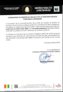 Accueil ACTUALITES Urgent-Guinée : les journées de lundi 9 et mardi 10 juin sont fériées... ACTUALITES Urgent-Guinée : les journées de lundi 9 et mardi 10 juin sont fériées (officiel) Par DIRECTEUR DE PUBLICATION - 9 juin 2025 456 Facebook Twitter Pinterest WhatsApp A travers un communiqué officiel signé par le secrétaire général de la fonction publique, lez journées de lundi, 9 juin et 10 juin 2025 sont exceptionnellement déclarées chômées et payées sur toute l’étendue du territoire national. ARTICLES CONNEXESPLUS DE L'AUTEUR Élections de mai 2026 : Le dépôt des candidatures prolongé jusqu’à minuit Élections du 24 mai : le Bloc Libéral de Faya Millimouno tranche sur sa participation CRISE À L’AGEPI : L’imposture juridique et le naufrage moral d’une fronde aux abois